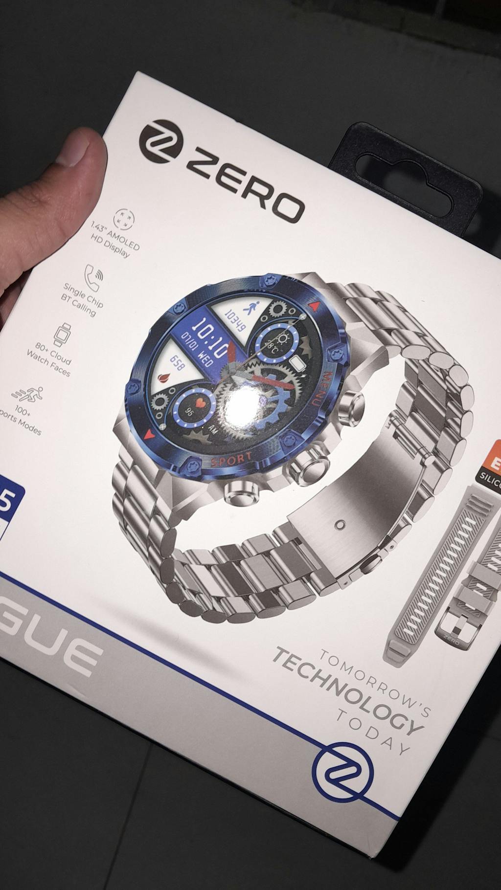• The package includes the smartwatch device, a charging cable, a user manual, and a warranty card.